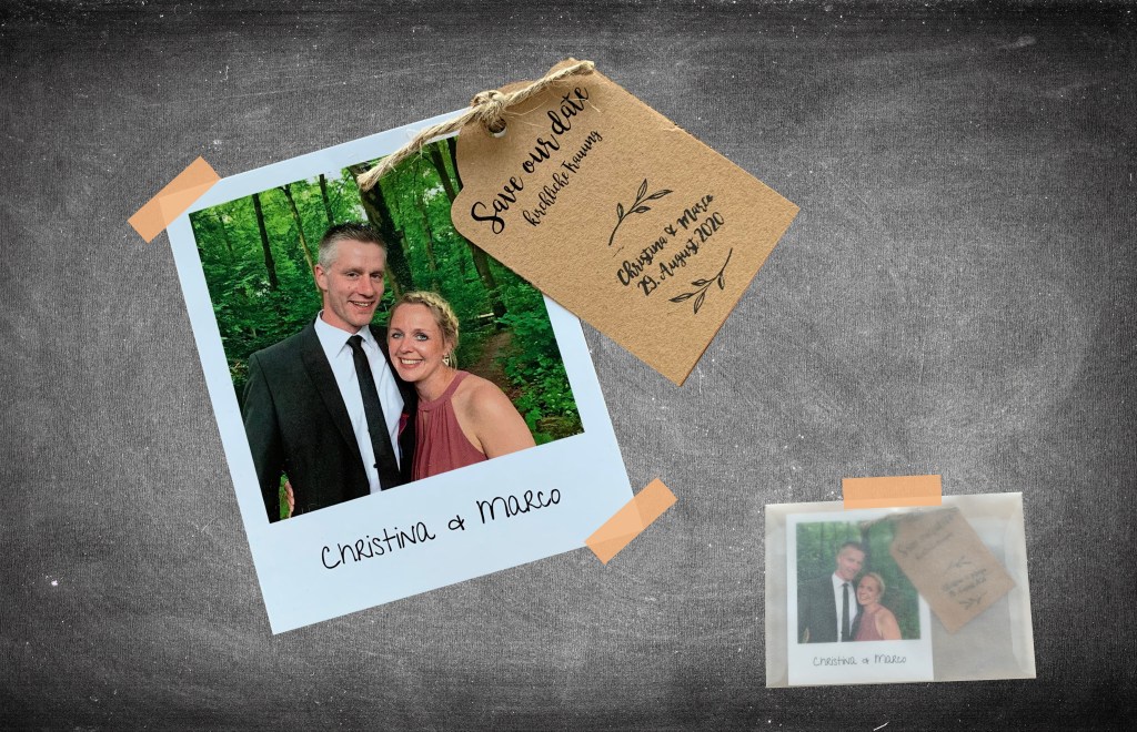 Gerne möchte ich hier die Save the date Karte einer guten Freundin zeigen. Hier haben wir vorab eine Gestaltungslinie festgelegt. Derzeit arbeiten wir an der Einladung für die Hochzeit, die natürlich in diesem Stil fortgeführt wird. Der Stempel auf dem Anhänger wurde extra nach unserer Vorlage produziert.